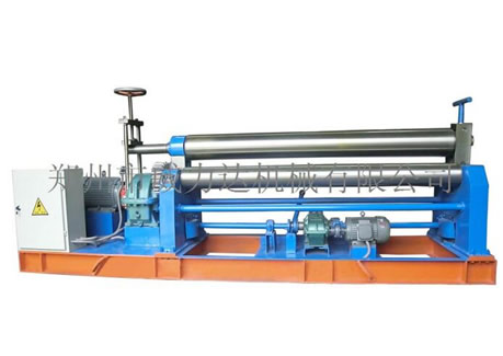 該機(jī)為手動(dòng)對(duì)稱式三輥卷板機(jī),兩下輥為主動(dòng)固定輥,正、反向旋轉(zhuǎn)運(yùn)動(dòng)有主電機(jī)帶動(dòng)減速機(jī)提供的彎曲扭矩來(lái)實(shí)現(xiàn);上輥在兩下輥中央對(duì)稱位置做升降運(yùn)動(dòng),上輥升降運(yùn)動(dòng)靠手板手輪帶動(dòng)升降絲桿來(lái)實(shí)現(xiàn)。該機(jī)結(jié)構(gòu)簡(jiǎn)單,操作方便,適合8毫米以下板材。